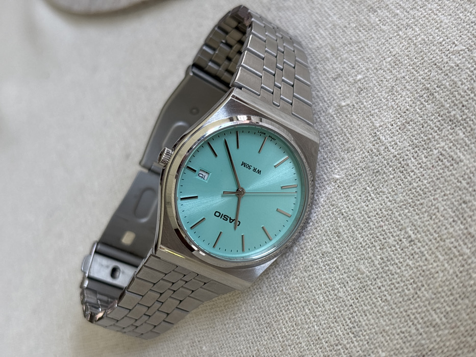 A silver-colored Casio wrist watch with a turquoise-blue sunburst dial is positioned on a light-colored, textured fabric surface