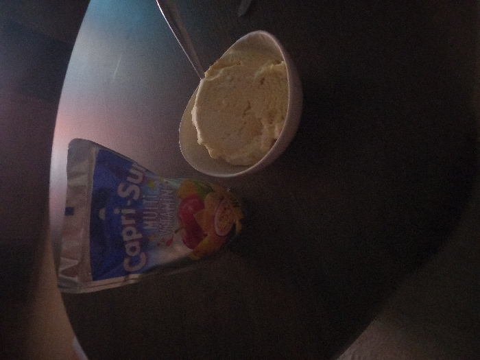- "A small white bowl filled with off-white ice cream sits on a dark table, partially obscured by a Capri-Sun Multi-Vitamin juice pouch" by FM-MtLfs2, licensed under CC BY 4.0