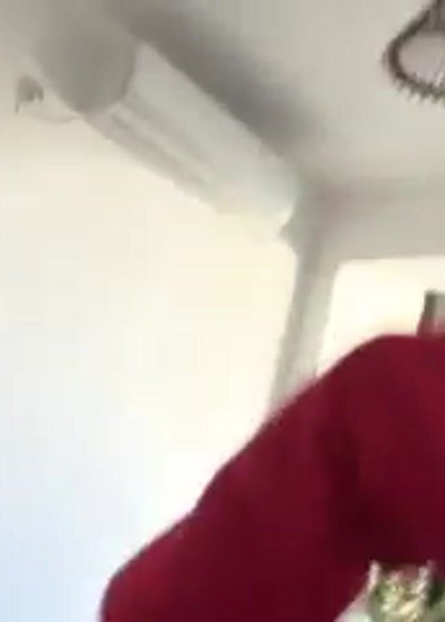 person lying on their back on a wooden floor, wearing a Santa hat. They stick their tongue out. Another person dressed in red shorts appears to be jumping over them. A Christmas tree is visible in the background. A group of people sit at a table behind the person on the floor.