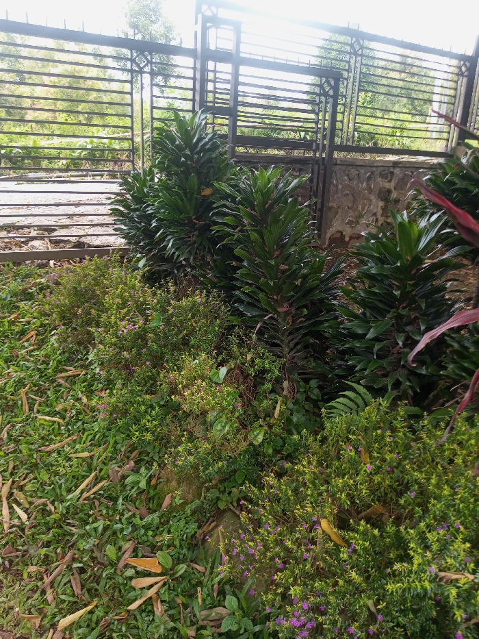 The scene depicts an outdoor garden or landscaped area in Tecuci, Romania. The foreground features green grass intermingled with scattered dried brown leaves. Directly behind this, a dense grouping of shrubs with small green leaves and numerous small purple flowers spans the lower-mid section. To the right of these flowering shrubs, three upright plants with large, dark green, elongated leaves are prominent, one displaying a visible yellowed leaf. A plant with reddish-hued leaves is partially visible on the far right. The background is dominated by a dark metal fence or gate, characterized by horizontal bars and decorative scrollwork, erected on a low, light-colored stone or concrete wall. Beyond the fence, dense green foliage and trees are visible beneath a brightly illuminated sky causing some glare. A section of an unpaved or dirt path is visible through the fence on the far left. No individuals or animals are present.