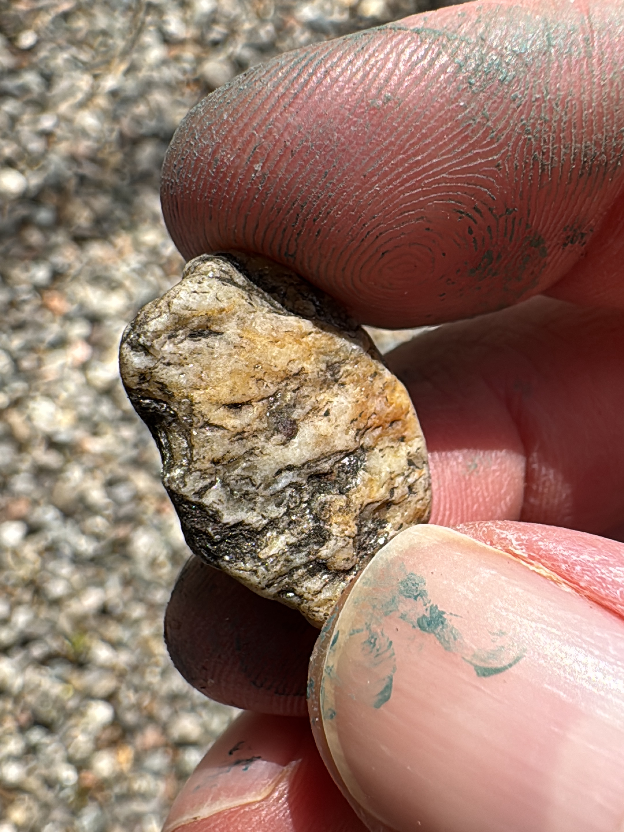 A close-up photograph displays a human hand, specifically two fingers, grasping a small, irregular stone against a blurred background of light-colored gravel. The skin on the fingers is reddish-pink, marked with dark particulate matter and exhibiting distinct dermatoglyphs on the upper finger. Greenish-blue residue is present on the lower finger, extending onto the visible portion of its fingernail. The stone, approximately 3-4 cm in its longest dimension, presents a mottled pattern of light brown, dark brown, black, and white hues, with a rough, uneven texture and apparent mineral inclusions. The scene is brightly illuminated, likely by direct sunlight, casting shadows. The environmental setting is an outdoor, unpaved surface. This image was captured in Erba, Italy.