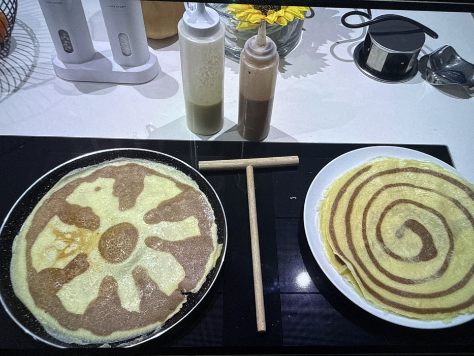 In a kitchen in Pétange, Luxembourg, an overhead view captures a food preparation scene. A black frying pan rests on a dark, reflective stovetop, containing a round pancake approximately 25-30 cm in diameter. This pancake displays a two-tone pattern of light yellow and medium brown batter, forming a radial design with a central circle and eight irregular, lobe-like shapes extending outwards. Directly below the frying pan, a light-colored wooden T-shaped crepe spreader tool is positioned horizontally on the stovetop. Further below and to the left, a white oval plate holds a finished pancake, approximately 20-25 cm in length, featuring a tightly wound concentric spiral pattern composed of light yellow and brown batter. To the right of the stovetop, on a lighter, reflective countertop, two translucent squeeze bottles with white pointed nozzles stand upright. The upper bottle contains a pale, opaque liquid, while the lower bottle holds a dark brown, opaque liquid. A decorative element, partially visible behind the squeeze bottles, features yellow petals resembling a sunflower. In the upper right quadrant, a white wall-mounted unit with two vertical cylindrical receptacles is present. A reflective metallic object with a black handle is partially visible at the bottom right.