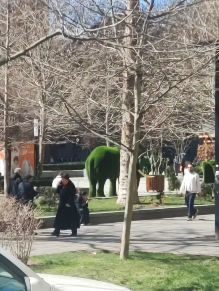 The scene depicts an outdoor urban park area, identified as Tumanyan Park on Baghramyan Avenue in Yerevan, Armenia. The environmental conditions suggest a season of deciduous dormancy, with numerous bare-branched trees dominating the upper and mid-ground. The ground consists of paved walkways and green grass segments. In the mid-ground, a large, light green topiary sculpture of an elephant stands on a patch of grass to the right of center, oriented with its rear and right side visible. A smaller, indistinct green sculpture is partially visible behind it. A light-colored curb separates the paved path from the grassy areas. Several individuals are present: 1. A woman in a long, dark coat is walking from left to right on the paved path in the left-center, holding a white object (consistent with a mobile phone) to her right ear. 2. A child, also in dark clothing, is positioned behind and to the right of the woman, at a lower elevation, possibly seated on the grass or curb. 3. A man with a visible beard, wearing a light-colored jacket and dark pants, is walking from left to right on the paved path in the mid-right. 4. A cluster of two to three individuals in dark attire are partially obscured by trees in the background on the far left. 5. Additional blurred figures are discernible further in the background. In the lower-left foreground, the white hood and windshield of a vehicle are partially visible, indicating the observation point. The background on the left features a large, vertically oriented orange poster or billboard with text in Armenian script. Dark structures are visible behind the trees in the distance. The sky, partially visible through the branches, is light blue.