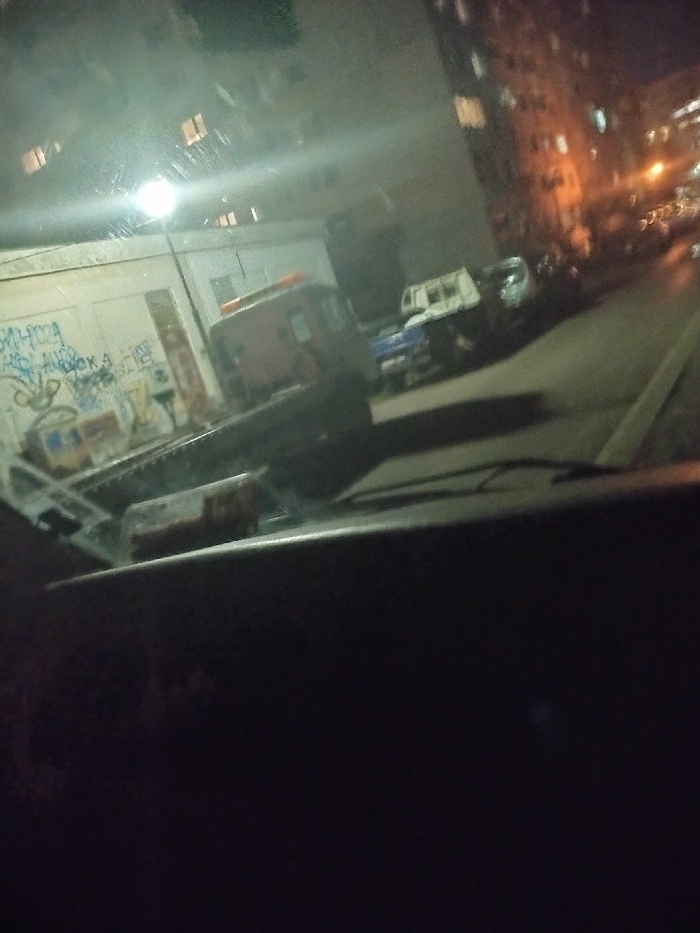 The image displays a nighttime urban scene in Sofia, Bulgaria, captured from inside a vehicle through a windshield exhibiting reflections and streaks. The immediate foreground shows a dark dashboard, with a rectangular object resting upon it and the base of two windshield wiper blades partially visible. In the midground, a street or alleyway extends into the distance. A flatbed utility truck with an orange-red cab and a visible load is parked on the left side, facing away from the observer. Behind this truck, a single-story building with a large bay door is visible, its wall heavily marked with graffiti, including the Cyrillic text "БЯЛА НОЩКА." A prominent, bright streetlamp on the left creates significant lens flare across the upper-left quadrant of the windshield. Further along the street, additional parked vehicles are discernible, including a blue pickup truck. The background on the right features a multi-story residential building with several illuminated windows. Other distant artificial light sources are present, contributing to the overall dim illumination of the scene. No individuals are depicted or identifiable within the frame.