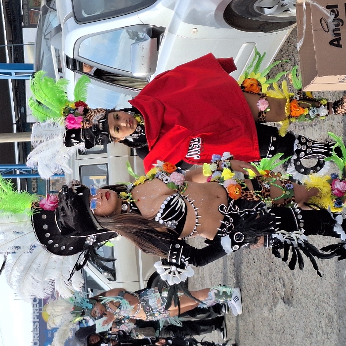 The image displays two females in elaborate, vibrant costumes in an outdoor setting in José Luis Bustamante y Rivero, Peru. The primary subject, positioned left of center, is a young adult female wearing a black headdress adorned with white and green feathers, silver studs, and a pink artificial flower. Her attire includes a black bra-top with white trim and silver sequins, decorated with dangling white beads. Her left arm features a black gauntlet with white and black accents. Her lower body is covered in black and leopard-print fabric embellished with numerous colorful artificial flowers (pink, orange, yellow), green feathers, and additional white beads. White powder or glitter is visible on her chest and shoulders, and she wears rectangular sunglasses. To her right, a younger female, possibly a teenager, wears a similar black and leopard-print headdress with green feathers and pink flowers. She is holding a red hooded sweatshirt, partially covering her torso, with "JOSE BUSTAMANTE" text visible on the front. Her lower costume aligns with the primary subject's, featuring black, leopard-print elements, colorful artificial flowers, and green feathers. Both individuals are standing on an asphalt or concrete surface. In the background, other individuals in similar festive attire are present, largely out of focus. Behind the subjects, a light-colored van and a silver sedan are parked. Structures with blue accents and partially legible signage are also visible in the background. A brown cardboard box with the word "Angel" is partially visible in the bottom right corner. The scene depicts participants in what appears to be a cultural procession or public event.