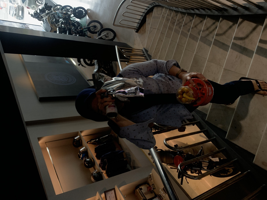 A person wearing a blue shirt and a dark turban stands on metal stairs with a red tin of cookies in their left hand and a small bottle in their right. Behind them is a display of motorcycles and a gray wall with a sign. A staircase with metal railings leads up towards a landing. The composition is tilted to the right.