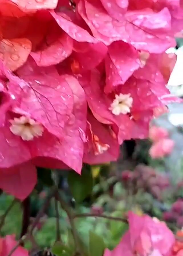 close-up of bright pink bougainvillea flowers covered in raindrops. The camera then pans out slightly, revealing other plants in a garden setting and a blurry view of a house in the background. A child's cry can be heard in the background. The focus returns to the bougainvillea flowers, highlighting the water droplets clinging to the petals.