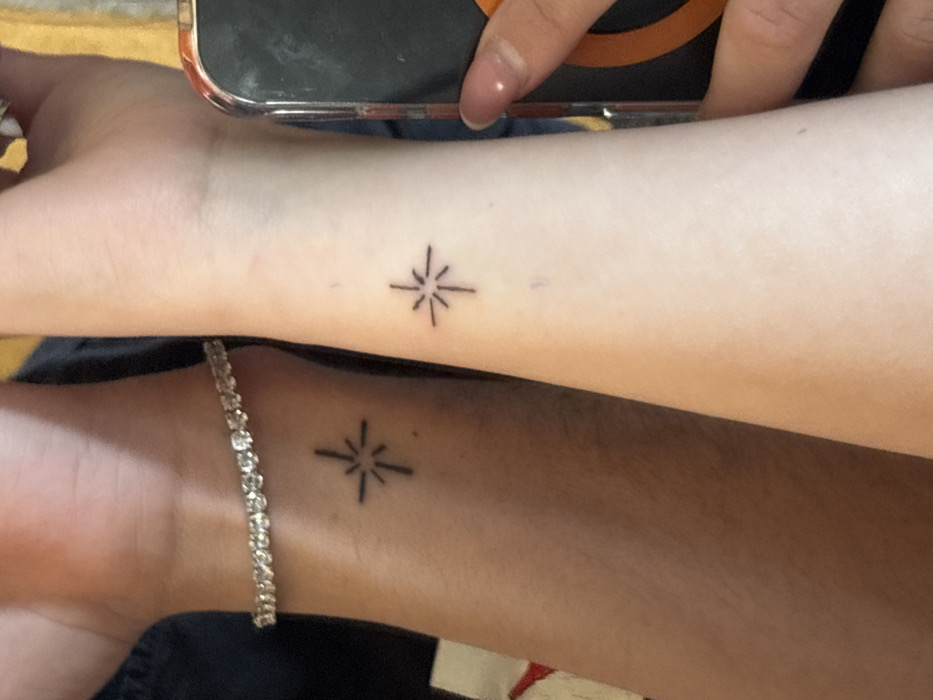 The image captures a close-up view of two human forearms positioned side-by-side in Mikrevo, Bulgaria. The forearm on the left, displaying a darker skin tone and fine hair, features a black minimalist star tattoo on its inner wrist and a multi-stone clear bracelet. The forearm on the right, displaying a lighter skin tone, exhibits an identical black minimalist star tattoo on its inner wrist. A fair-skinned hand, with a polished fingernail, partially visible on the right, holds a smartphone featuring a reflective screen and an orange detail on its case. The background is indistinct and out of focus.