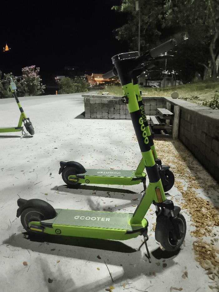 The image presents a nighttime scene in Baan Chaweng, Thailand. Three neon green and black 'GCOOTER' electric scooters are positioned on a light-colored paved surface. In the immediate foreground, one scooter stands upright on its kickstand, oriented away from the camera and angled slightly to the right. Directly in front of it, another GCOOTER lies on its left side on the pavement. A third scooter is visible standing upright in the mid-ground to the far left. The pavement is sparsely covered with scattered dry, light brown leaves, predominantly on the right side. To the right, a low retaining wall, constructed from stacked rectangular stone blocks, separates the paved area from a grassy embankment featuring a wooden bench and mature trees. The background reveals a dark expanse, indicative of a body of water, likely a coastal area, with distant artificial lights from structures visible on the horizon. A distinct tall, orange-yellow illuminated structure is discernible in the far left background. No individuals or active subjects are present in the scene.