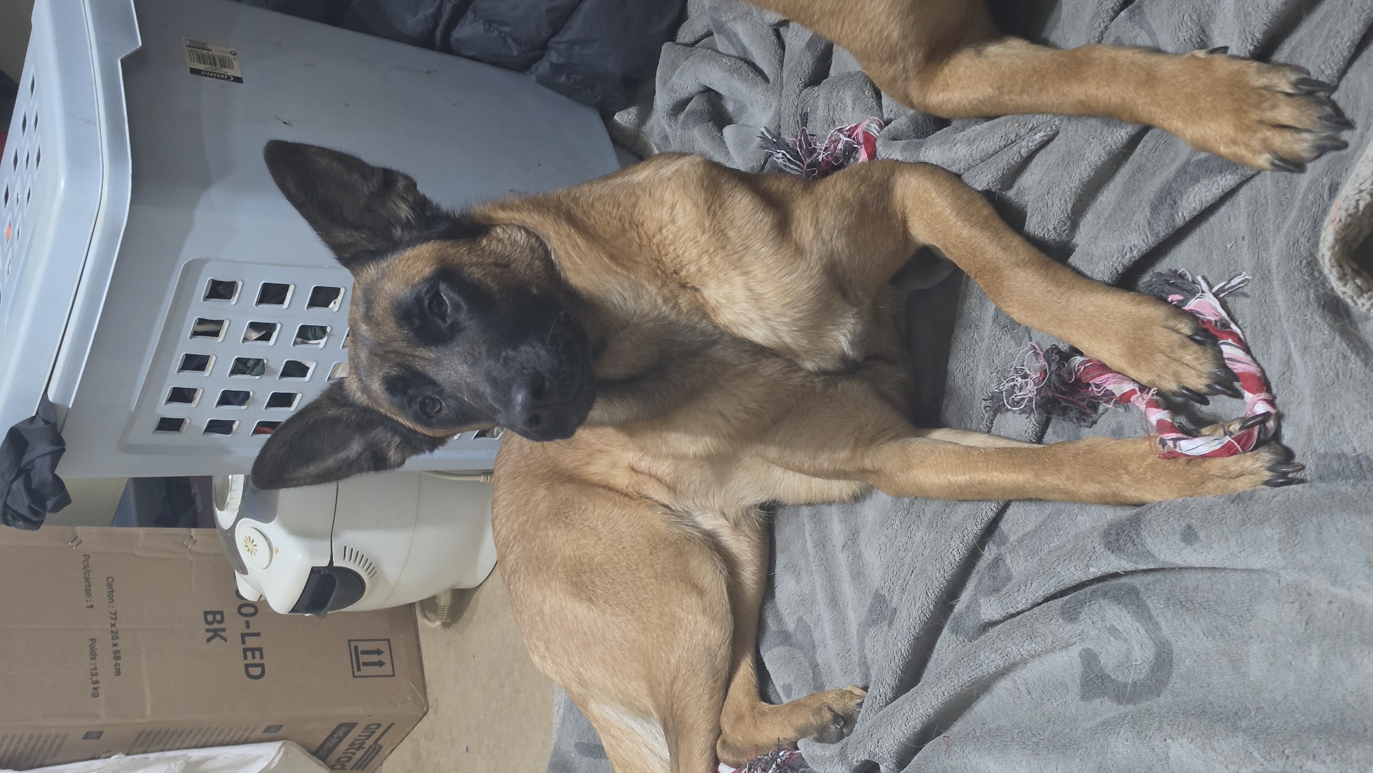 The scene is an indoor setting in Magny-les-Hameaux, France. A tan and black Belgian Malinois dog is lying on a crumpled gray blanket, positioned centrally within the frame. Its front paws rest on a red, white, and gray braided rope toy. The dog's head is turned slightly to its left, with its gaze directed forward. To the right, a portion of another tan dog's leg and paw is visible on the same blanket. In the background, from left to right, a large cardboard box labeled "AMSTRAD" and "O-LED BK" (inverted) with dimensions "77 x 25 x 58 cm" and "Poids: 13,5 kg" is present. Adjacent to the box, a white electric rice cooker or similar appliance with a dark gray lid and a visible power cord rests on the floor. Further right, a light gray plastic laundry basket containing clothing items is visible, with a black fabric draped over its top edge. The floor surface appears light-colored.