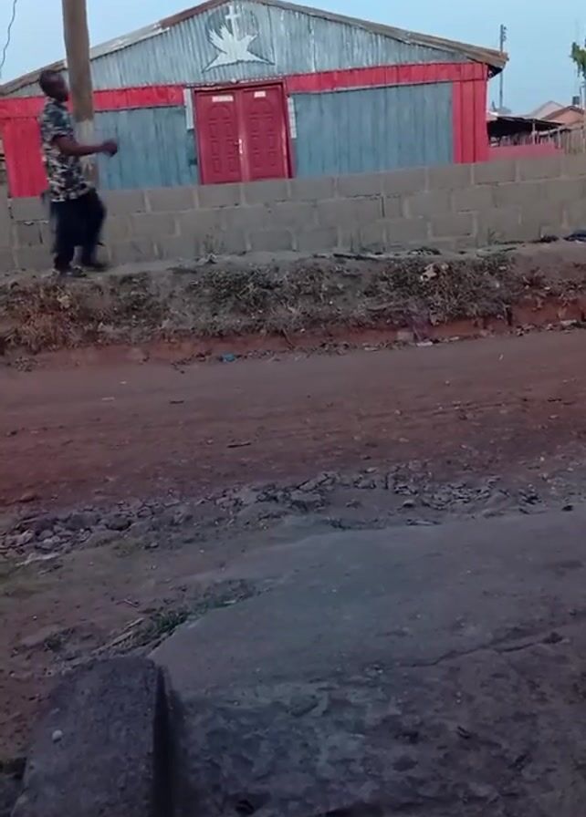 building with a silver metal roof, blue-gray siding, and red trim around the top and the door, which has a white dove painted on its front. A person wearing a dark shirt with light-colored leaves walks along the top of a cinderblock wall that runs in front of the building. The wall separates the building from a red dirt road in the foreground. Another person walks behind them, holding a piece of white paper. A dark blue car drives by on the dirt road to the left. There is a utility pole to the left of the building. A large, gray rock is in the foreground to the left.