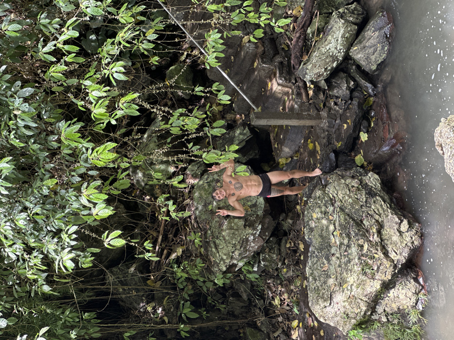 An adult male is observed standing barefoot on a wet, rocky riverbank in Ambengan, Indonesia. The individual is barechested, displaying a muscular physique and multiple tattoos across his chest, abdomen, and left thigh. He wears black swim briefs with a thin pink stripe along the side. Both of his arms are raised, with hands open, extending the index and middle fingers in a "peace" gesture. He is smiling towards the viewer. Behind the subject, the environment is characterized by large boulders, damp earth, and dense green tropical foliage, including numerous hanging vines. To the subject's immediate right, a concrete stairway equipped with a metal handrail descends towards the water. A body of murky water with minor surface agitation is visible in the lower foreground and extending to the mid-right of the frame.