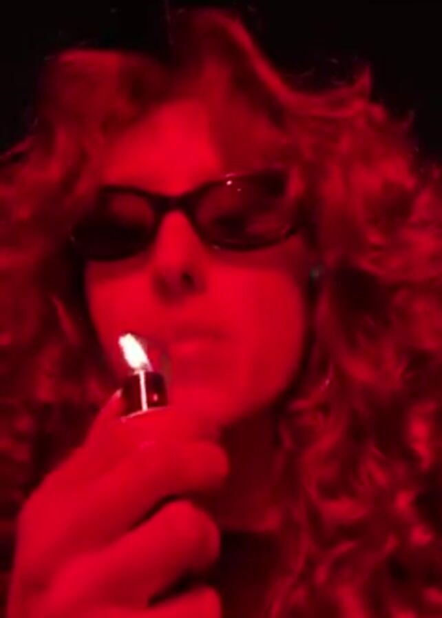 A close-up shot shows a person with long, curly hair and sunglasses, lit by a strong red light in an otherwise dark environment. They light a cigarette with a lighter and take a drag, then remove the cigarette and hold it in their hand while exhaling. Music plays in the background.