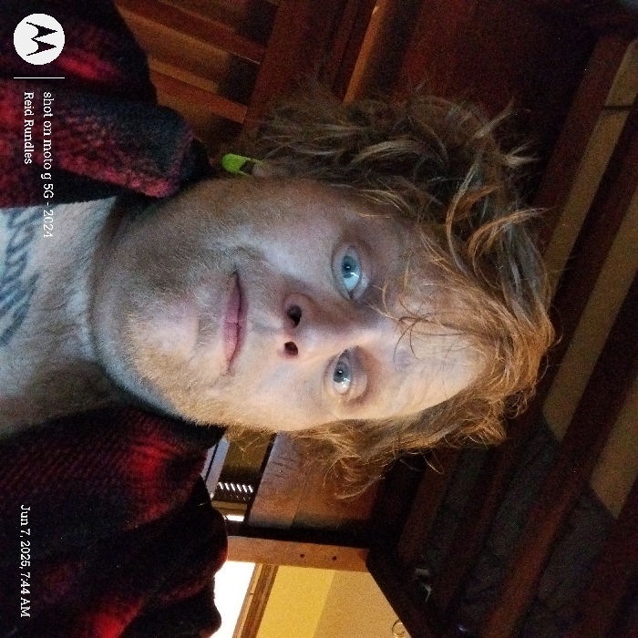 A selfie of a man with short, light brown, messy hair, wearing a red and black plaid robe. He has a light complexion, and he appears to have blue eyes. The man's mouth is slightly open, and he appears to be looking directly at the camera. The photo is taken from a low angle, with the man's head and shoulders filling most of the frame. The man appears to be sitting in bed or on a couch with a wood-colored frame behind him. There is a Motorola logo in the bottom left corner, a caption in the bottom left that reads "shot on moto g 5G - 2024 Reid Rundles" and "Jun 7, 2023, 7:44 AM" in the bottom right corner. The coordinates provided in the prompt do not correspond to a specific location in Gainesville, Florida. Therefore, it is impossible to determine the location of the image.