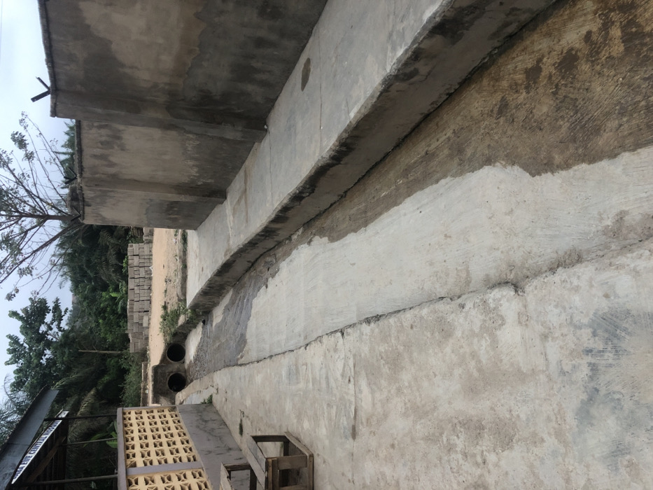 The image showcases an exterior concrete structure with visible weathering and aging