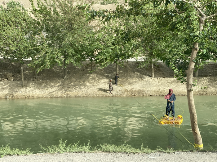 scene in Sard-E 'olya, Afghanistan. A man in a red headscarf stands on a small, yellow raft in the center of the image. The raft is tethered to the shore by a yellow rope that passes through a large tree trunk. The man is holding a long, thin stick, which he may be using to propel the raft or as a fishing rod. There are two other men, standing on the bank of a river, observing the man on the raft. The river is calm and green. On the bank, the ground is dry and dusty. The scene is surrounded by green trees. The image was taken on a clear day. The sun is shining brightly. The scene is quiet and peaceful.