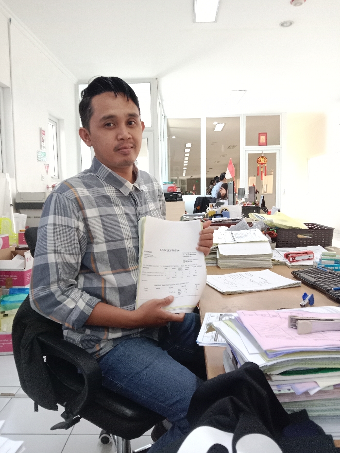 A man sits in an office chair, holding a stack of documents labeled "DELIVERY PAPER." He's wearing a plaid shirt and jeans. The desk is cluttered with paperwork, a calculator, stapler, and other office supplies. In the background, through glass doors, are more office workers and an Indonesian flag. The room is brightly lit with fluorescent lights.