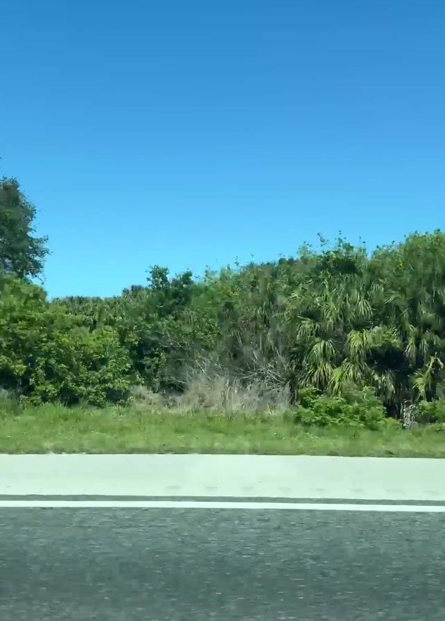 view from inside a moving vehicle, likely a car or truck, traveling along a paved road. The road has a solid white line marking its edge. Beyond the road is a stretch of green vegetation, consisting of trees and shrubs. The sky is a clear, bright blue. The camera is presumably mounted inside the vehicle, capturing the passing scenery. There are no visible people or other vehicles.