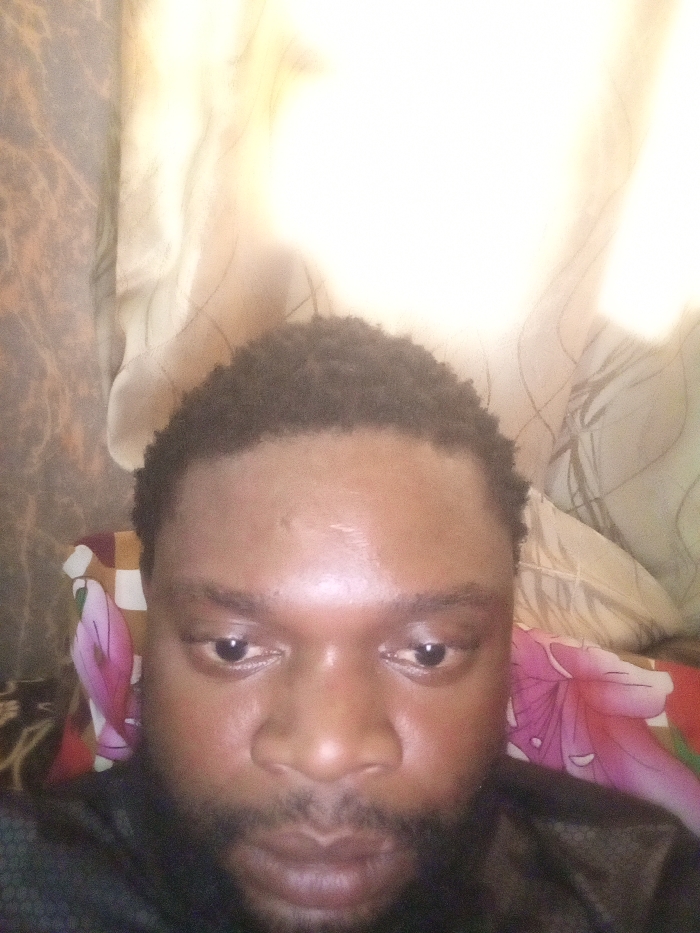 The scene is an indoor location within the city of Narayi, Nigeria. A single adult male with dark skin, short dark hair, and a beard occupies the foreground in a direct-gaze portrait. He is dressed in a dark, textured garment. A minor scar is visible on his forehead. The background features a dark brown textured surface on the left and a pillow with a distinct pink floral pattern on the right, alongside a lighter patterned fabric. Intense light sources cause overexposure in the upper background.