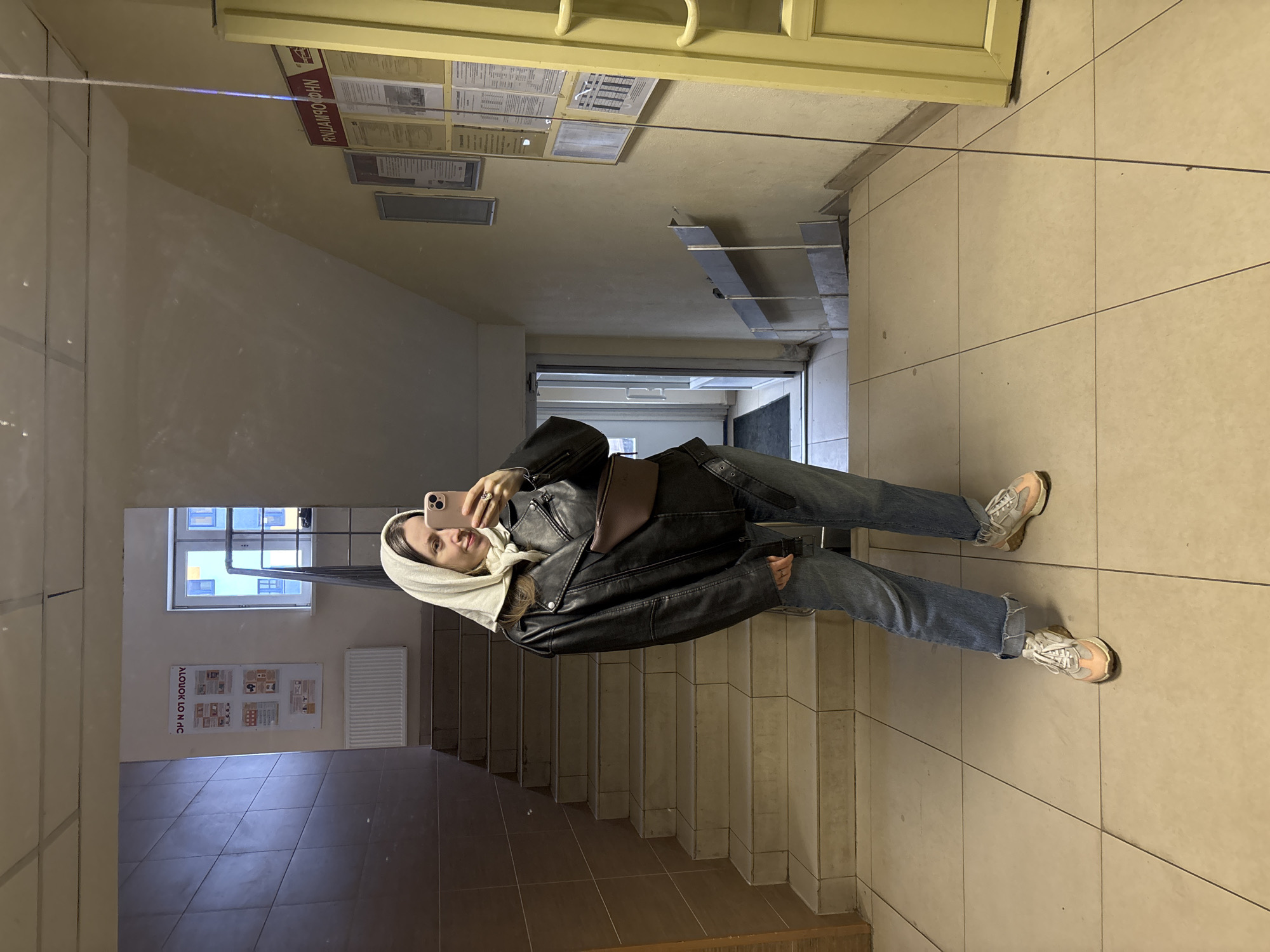 A woman is standing on a landing in what appears to be the stairwell of an apartment building, likely located in Kudrovo, Russia. She is taking a selfie with her smartphone, which is clearly visible in her hand. The woman is wearing a headscarf, a black leather jacket, a handbag, blue jeans, and sneakers. She is standing on tiled flooring. The stairwell features stairs leading both upwards and downwards. A window with a view of the surrounding buildings is seen to the left. A notice board with information posters is visible on the wall near the window. Additional posters are displayed on the walls in the background. The lighting appears to be a combination of natural light from the window and artificial light from overhead fixtures. The walls are painted in light colors.