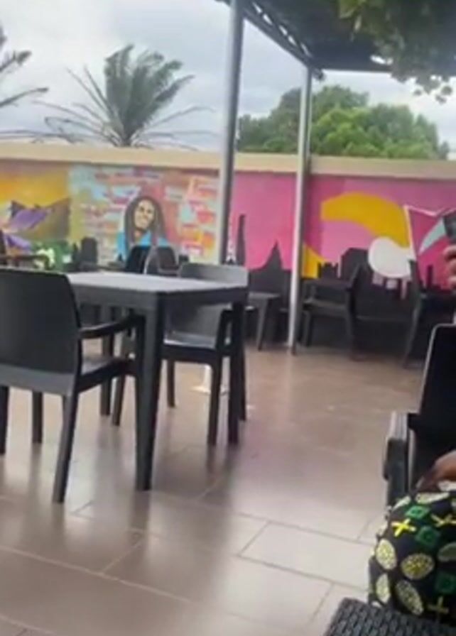 n outdoor patio, likely at a restaurant or cafe, adjacent to a swimming pool. The patio has black wicker furniture, including chairs and tables. The floor is tiled. A wall behind the tables is painted with a mural featuring images of Bob Marley and city skylines in bright colors. In the background, palm trees and other greenery are visible. The sky is overcast. A person is seated on a chair and appears to be holding and looking at a smartphone. Two black water tanks are on the roof. The pool has several inflatable red circles.