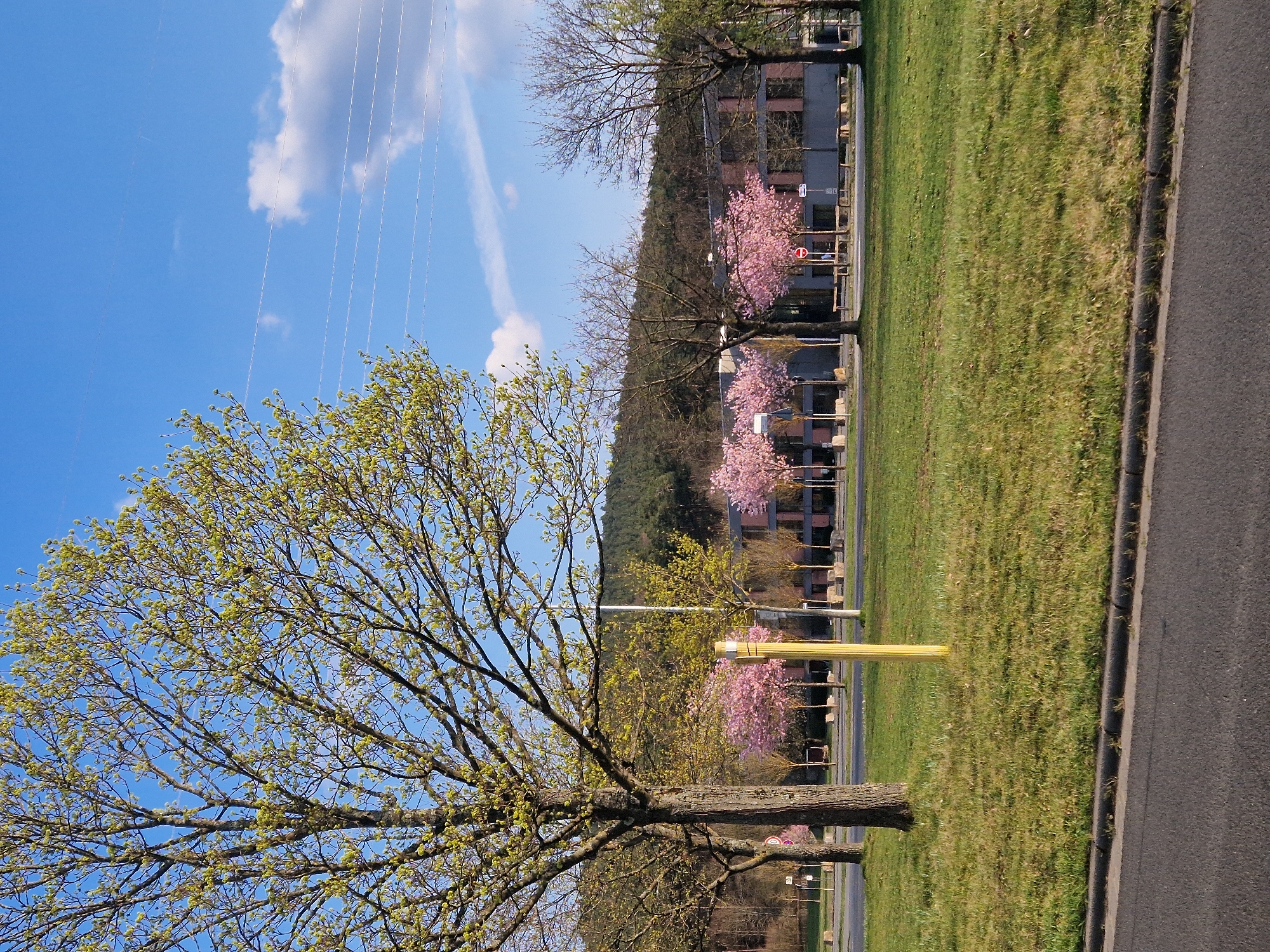 The image displays an outdoor scene in Elsenfeld, Germany, under a clear blue sky with scattered white clouds, illuminated by direct sunlight. In the immediate foreground, the edge of an asphalt road with a dark grey curb is visible. Adjacent to the road, a strip of green grass, showing variations in tone, extends into the midground. A large deciduous tree with a thick trunk and branching canopy, covered in small, bright green budding leaves, occupies the left side of the midground. To its right, centered in the midground, stands a bright yellow, cylindrical pole, approximately 1.5 meters in height. Further back, a paved area, potentially a parking lot or pedestrian walkway, runs horizontally across the frame. Along this paved area, multiple trees with vibrant pink blossoms (cherry trees) are prominently arranged, interspersed with other deciduous trees, some budding green and others still bare. Behind these trees, modern-style buildings with dark reflective windows and reddish-brown brick or paneling are visible. Street signage, including a red circular 'no entry' sign and a blue directional sign, is present near the buildings. Stone blocks or benches are arranged along the paved area. In the background, a densely forested hill rises, dominated by dark green foliage, forming the horizon line. The sky above is a rich blue, featuring several thin, horizontally oriented lines, possibly power lines or contrails, traversing the upper portion of the frame. No individuals or specific actions are discernible within the scene.