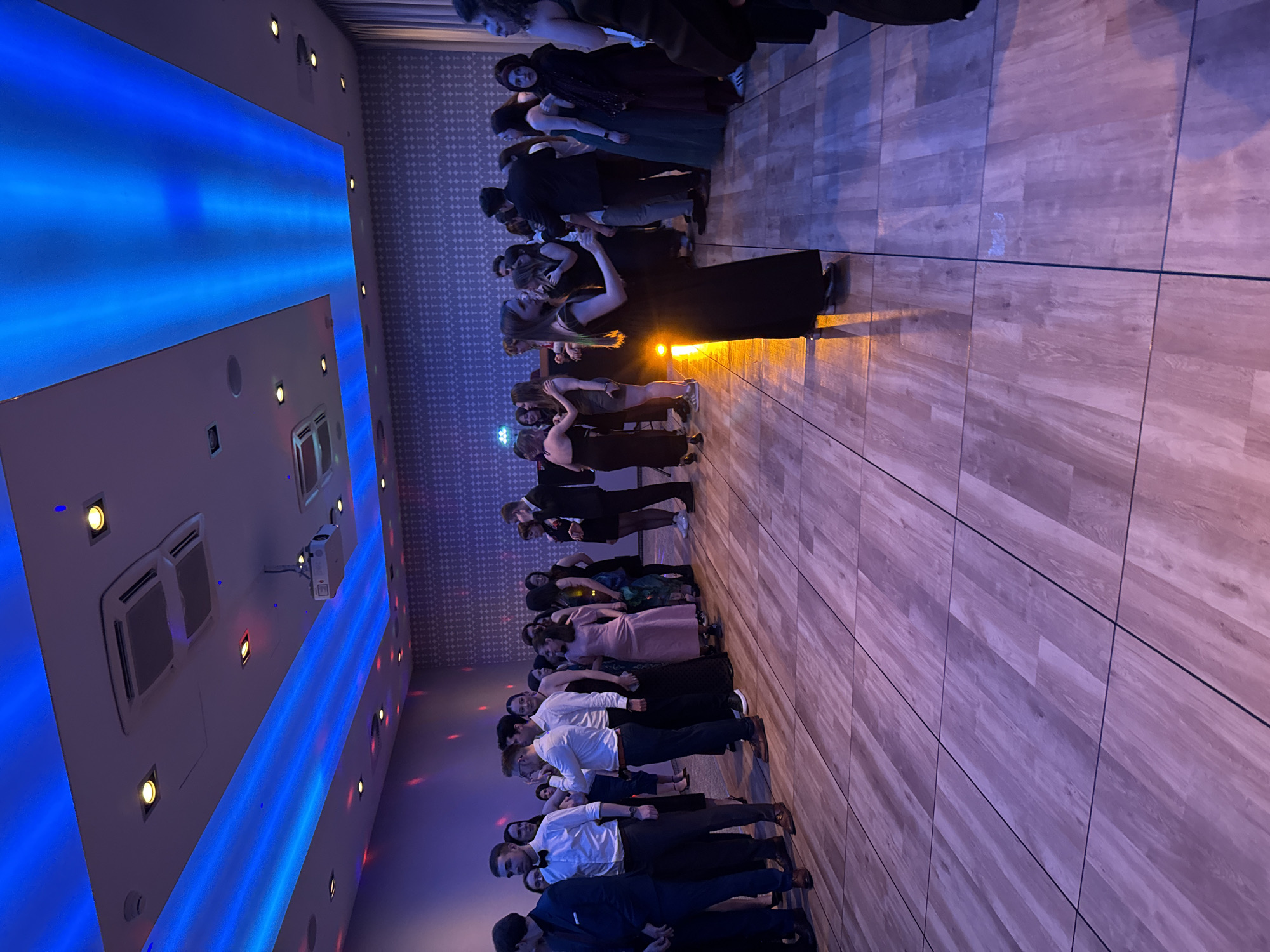 group of people in what appears to be a ballroom or event space, possibly in Bydgoszcz, Poland. The group is lined up and some individuals seem to be dancing or interacting. The interior features blue and purple lighting, and a tiled floor. Some of the people are dressed in formal attire, including suits and dresses. There are light fixtures and some equipment visible on the walls and ceiling.