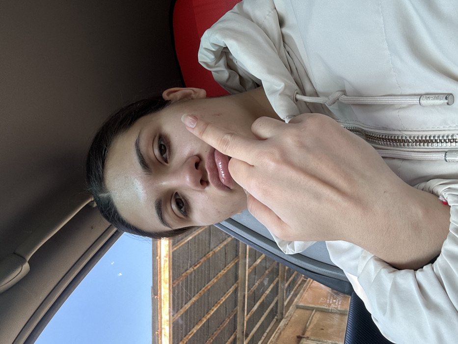 A female individual is depicted in a close-up, selfie-style photograph taken inside a vehicle