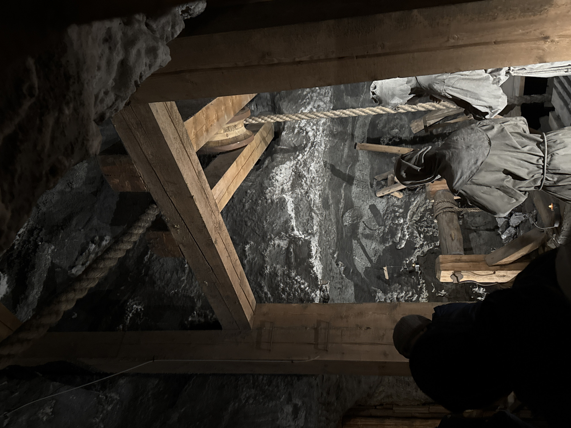 The image depicts a scene within the Wieliczka Salt Mine in Wieliczka, Poland. The viewpoint is from beneath a wooden framework. Ropes span between timbers. Above the framework is a textured, grey, rocky surface. A clothed figure, presumably a mannequin, stands on wooden scaffolding within the cavernous space. A person wearing a dark jacket and light gray knit hat is also in view, but the majority of their form is out of focus.
