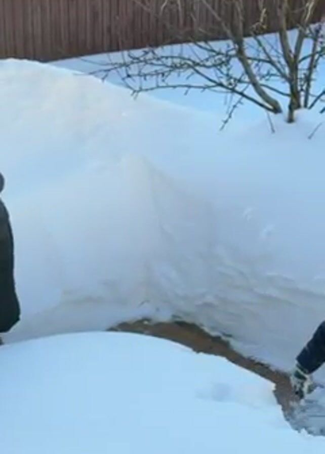 A woman and two children are walking through a snow-covered area. The woman is wearing a dark puffer jacket and khaki pants. One child is wearing a pink and purple patterned jacket and a gray hat with a pom-pom. The other child is wearing a navy blue puffer jacket with a fur-trimmed hood and a black hat. They are walking through deep snow near a brown wooden fence and a small tree without leaves. The area appears to be a yard or garden covered in snow. The sky is visible in the background.