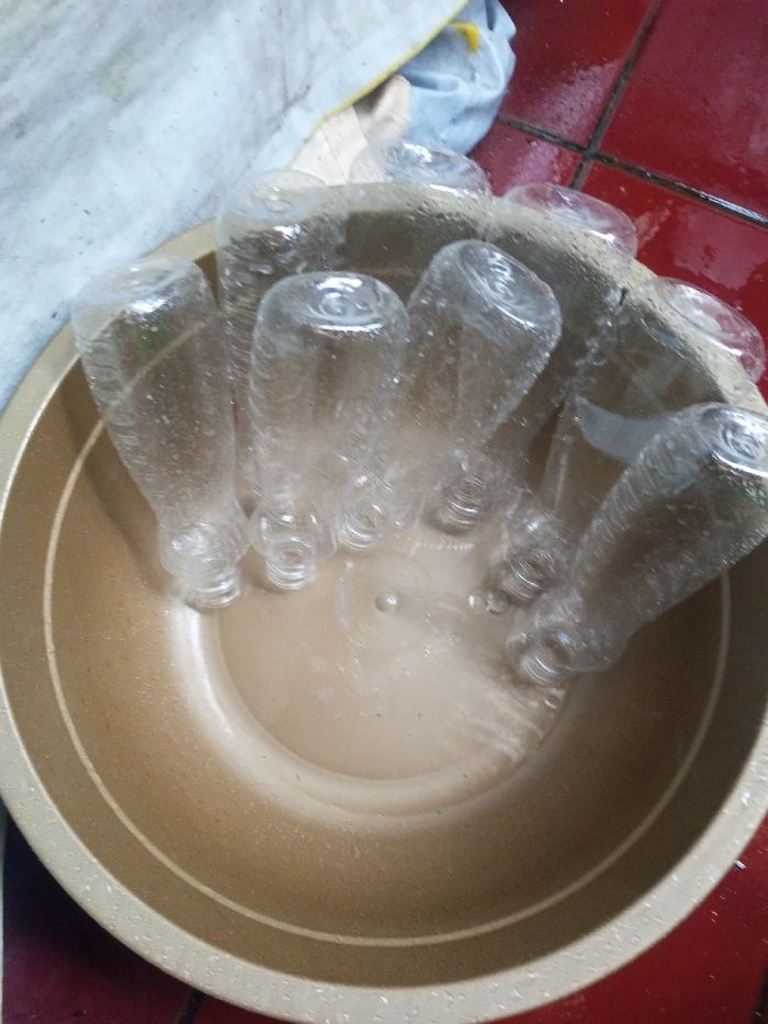 The scene depicts a collection of approximately ten clear, empty plastic bottles inverted within a light brown or beige plastic basin