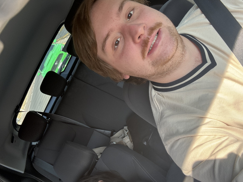 A selfie of a man in the front seat of a car, wearing a light-colored shirt with a dark trim. The back seats are visible, with a bag placed on one of them. A bright green vehicle is visible through the rear window, parked outside. The car is brightly lit, suggesting a sunny day. The man has light brown hair and a mustache.