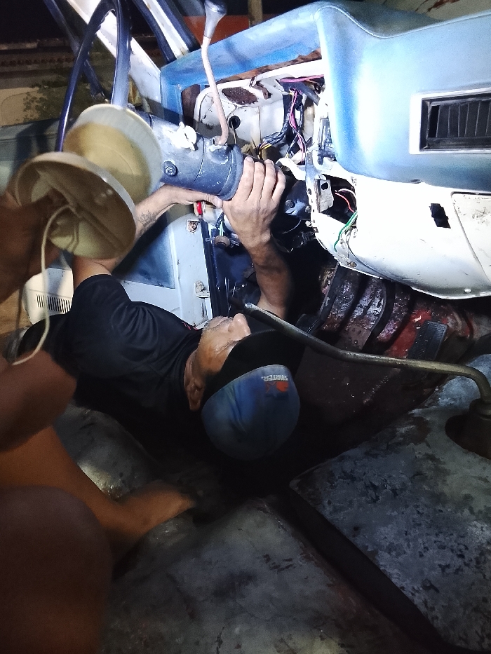 An adult male is observed lying on his back, working on the electrical system and steering column of a vehicle. He wears a black short-sleeved shirt and a blue "STARTER" baseball cap. His left hand, holding a red-handled tool, manipulates exposed wiring within the partially disassembled steering column, which features an upper gear shift lever. The vehicle's dashboard is light blue on top and off-white below, with an air vent visible. The firewall and floor beneath the dashboard exhibit rust and dark stains. Another individual, partially visible in the left foreground, holds a white, dual-head portable work light, directing illumination towards the repair area. A vintage-style metal lamp with a curved neck is visible on the floor in the lower right. The scene is dimly lit, indicating either night or an indoor space with low ambient light. There are no discernible visual cues within the image to specify the location as San Antonio, Venezuela.