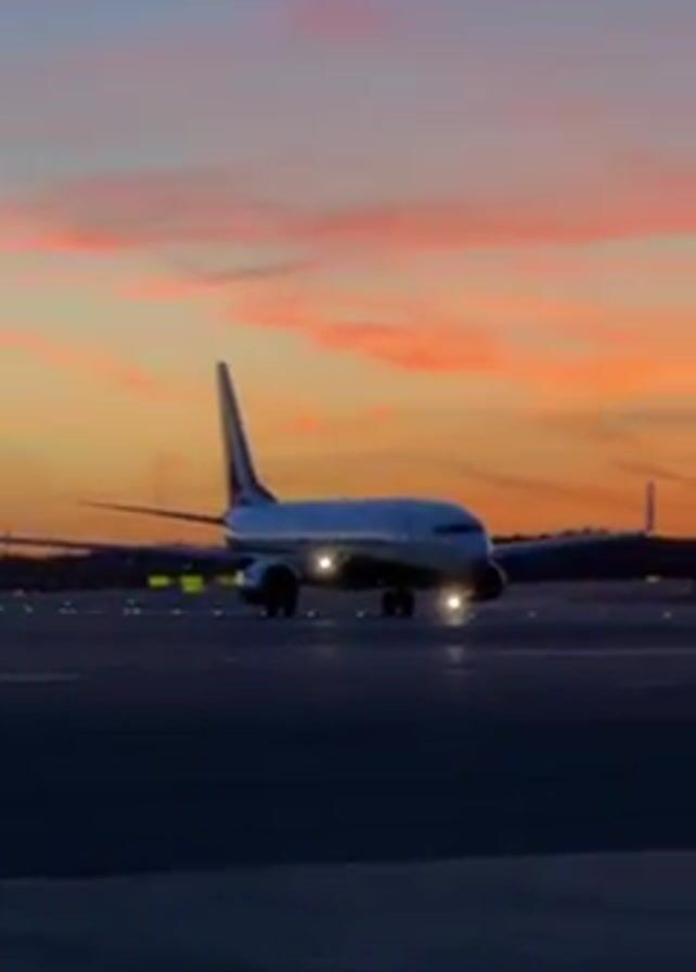 n airplane taxiing on a runway at dusk