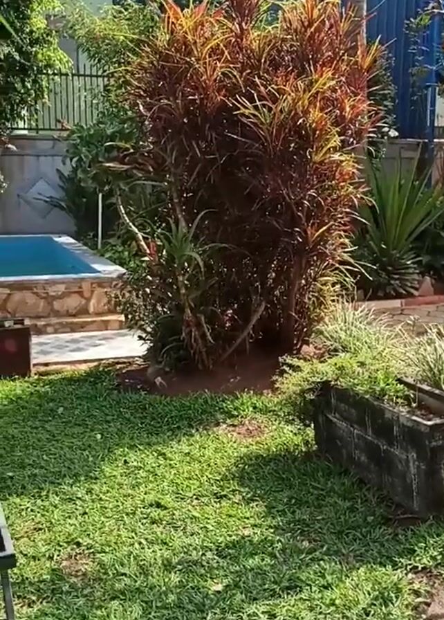 The camera pans across a well-maintained backyard featuring a small, rectangular swimming pool with a stone border. The pool is surrounded by green grass, plants, and trees, suggesting a lush, tropical environment. Several metal-framed lounge chairs are arranged on the lawn, inviting relaxation. Additionally, there are potted plants placed around the pool area, including a tall, leafy plant in a large clay pot. A brick planter filled with greenery is also visible. In the background, a tall, blue fence adds privacy to the yard. The sun appears to be shining, casting shadows on the grass and adding to the overall tranquil atmosphere.