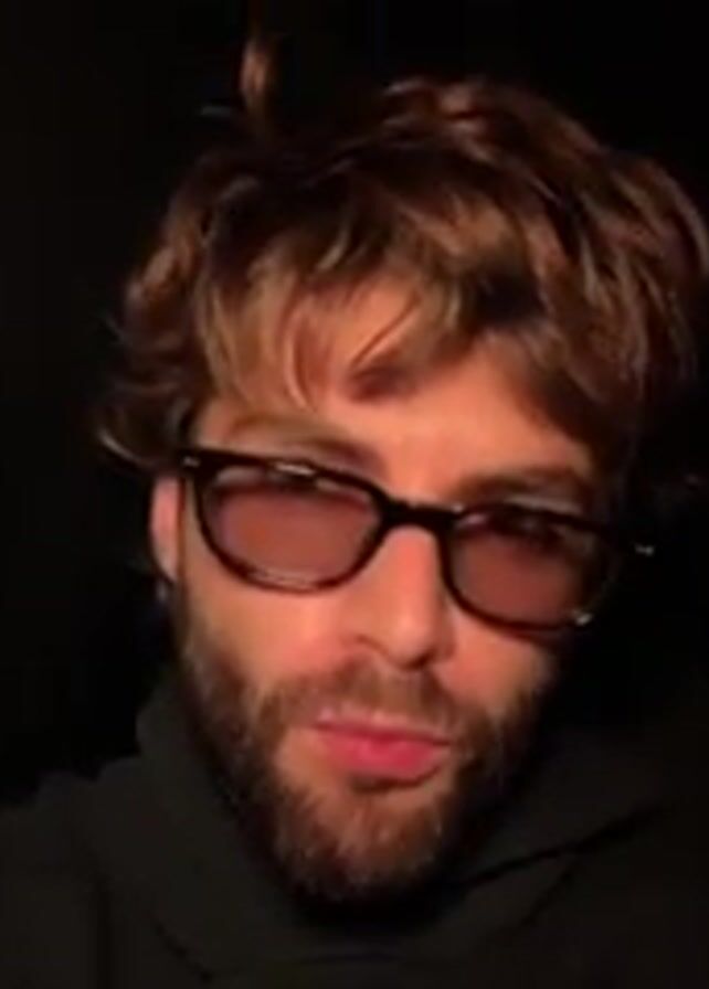 A man with fair skin, brown hair, a beard, and glasses is centered in the frame against a black background