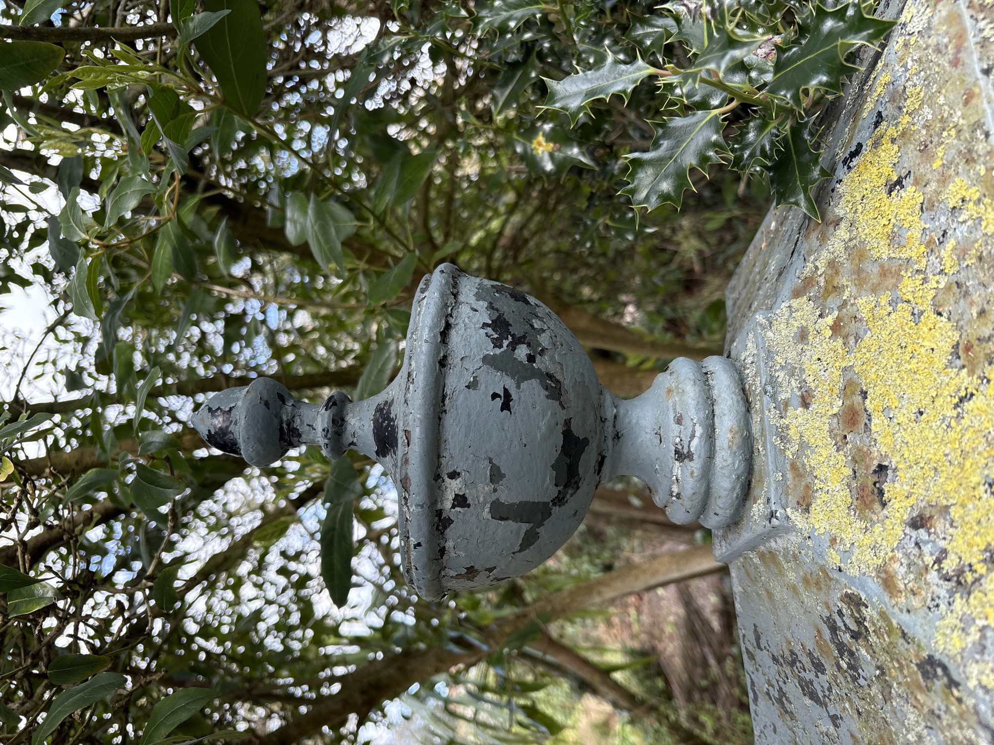 The image displays a close-up, outdoor scene in Pulverbatch, United Kingdom, focusing on a weathered decorative finial. The finial, light grey with significant peeling paint exposing darker underlayers and possibly rust, is urn-shaped with a pointed cap. It rests on a flat, broad post top, also light grey, heavily covered in patches of bright yellow lichen and exhibiting rust discoloration. To the immediate right, a branch of dark green holly with sharply serrated leaves is visible. The background consists of blurred green foliage from trees and shrubs, with dappled light suggesting an overcast or partially obscured sky. No people, animals, or discernible actions are present.