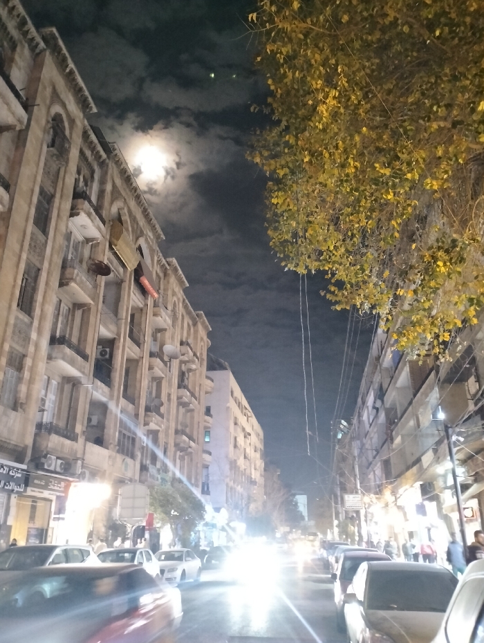 A nighttime street scene shows buildings lining both sides. Cars are parked along the street and driving in the center, with headlights creating bright flares. A tree with yellow leaves hangs over the right side of the frame. A bright moon is visible in the cloudy sky above the buildings. The architectural style of the buildings is traditional.