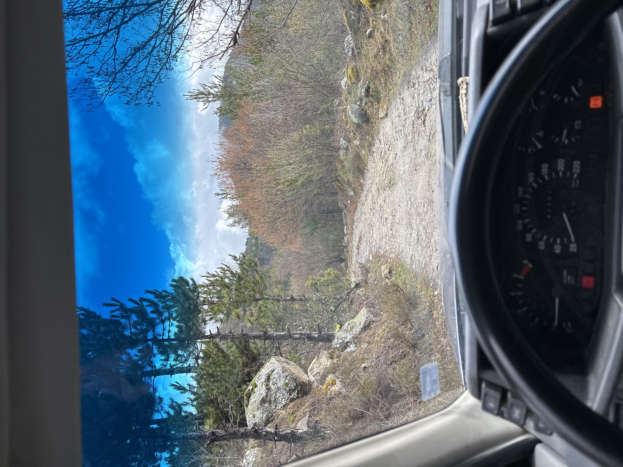 The image depicts a first-person perspective from inside a vehicle, looking forward through the windshield onto a rugged, unpaved road. The scene is located in the vicinity of Grohotno, Bulgaria. In the immediate foreground, the top of a dark steering wheel is visible at the bottom center, partially obscuring the lower portion of a black instrument cluster. The speedometer shows a needle near the zero mark, and a red warning light (possibly for a battery or oil pressure) is illuminated on the right side of the cluster. The dashboard is dark and textured, with a vertical array of three black buttons visible on the left side, near the windshield pillar. A light grey A-pillar and part of the headliner are visible on the left. The upper portion of the windshield is tinted blue, and a dark grey sun visor strip spans the top. A rectangular, reflective sticker is visible on the passenger side of the dashboard, seen through the windshield. The unpaved road, composed of dirt and scattered rocks, leads uphill and curves gently to the right, receding into the midground. The environment is sparsely vegetated, indicative of a mountain or hilly terrain. On the left side of the road, large, moss-covered boulders and smaller rocks are embedded in a steep, dry embankment. Several tall, slender evergreen trees (pines) with dark trunks grow on the left bank, alongside numerous dry bushes and sparse ground cover. On the right side of the road, similar dry bushes and some bare deciduous trees with thin branches are visible, suggesting early spring or late autumn. In the background, further hills or mountains are discernible, covered with a mix of evergreen and deciduous trees, some with emerging light brown or reddish foliage. The sky above is predominantly bright blue with scattered white and grey clouds, particularly towards the horizon. No people or animals are visible, and no explicit actions or interactions are depicted, beyond the implied presence of a driver in the vehicle.