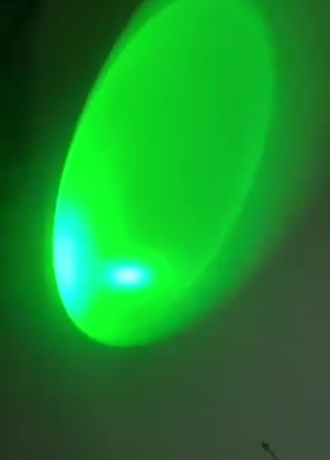 projection of light on a white surface. The light cycles through the colors green, blue, and orange. There is a small dark object on the white surface. A black object with the word "pointer" on it is visible in the upper left corner.