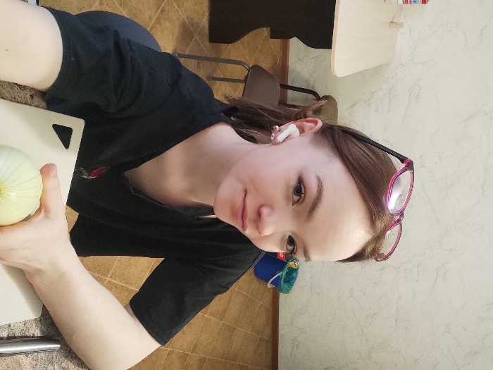A young female subject, facing forward, occupies the foreground of an indoor kitchen or dining area. She has brown hair pulled back, with pink and black-rimmed glasses resting atop her head. A white wireless earbud is in her left ear, accompanied by small, metallic ball earrings. She wears a black short-sleeved v-neck shirt and looks directly at the camera with a slight smile. Her right hand is visible in the lower right, grasping a light-colored, peeled onion on a white cutting board, which rests on a speckled countertop. In the background to the left, a light-colored wooden table with a dark pedestal base is partially visible, along with two dark-framed chairs featuring light seats. To the right of the subject, a blue bucket containing a light-colored plastic trash bag sits on the light brown tiled floor. The wall behind the subject is covered with light-colored, patterned wallpaper.