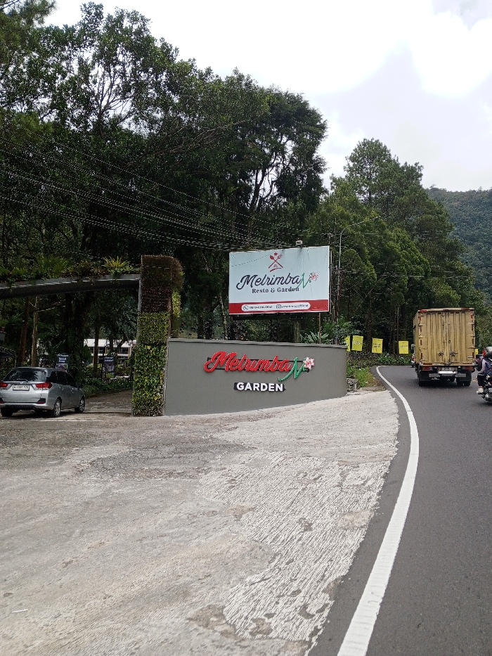 The image displays the entrance to "Melrimba Resto & Garden" in Cisarua, Indonesia