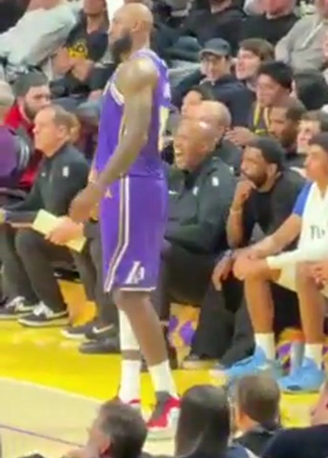 man wearing a purple and yellow basketball uniform with the number 23 and "James" on the back. He is standing on a basketball court, near a line of seated individuals, many of whom are clapping for him. The man raises his right arm briefly then turns and walks away from the camera. The court is surrounded by spectators in the stands.