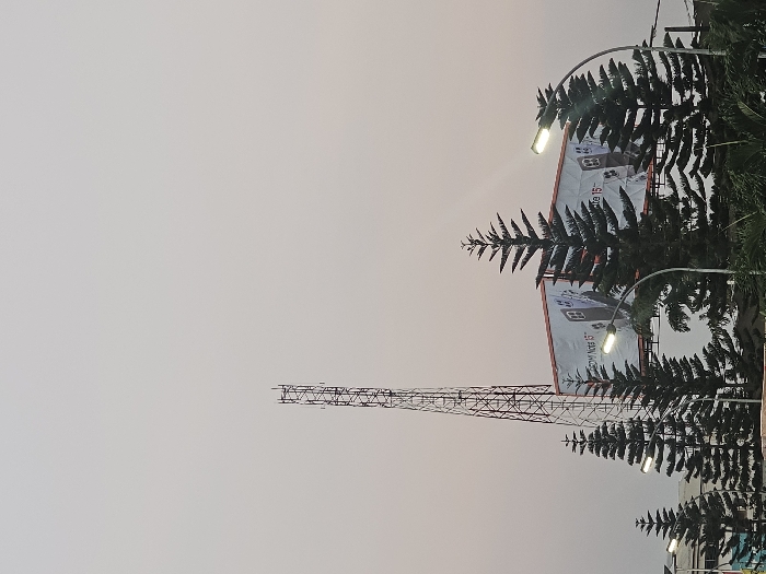 The image depicts an outdoor urban landscape at twilight or dawn, with a pale grey-pink sky dominating the upper two-thirds of the frame. A tall, dark lattice telecommunications tower stands prominently in the mid-ground, centered, with its structure extending high into the sky. Below and to the right of the tower, a large rectangular billboard displays an advertisement for a "Redmi Note 15" smartphone, featuring multiple phone images against a light background. Several dark green coniferous trees, consistent with Norfolk Island pines, are positioned in the foreground and mid-ground, partially obscuring the lower portion of the tower and the billboard. Two active streetlights with bright, illuminated fixtures on curved arms are visible, one in front of the billboard's right side and another partially behind a tree to the left. No individuals or vehicles are present. The location is the city of Unknown, Unknown.