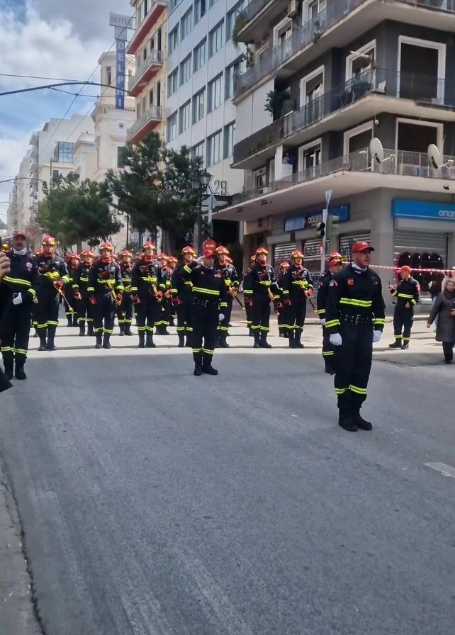 group of firefighters lined up on a street. They are wearing black uniforms with red helmets and white gloves. Some of them are holding brass instruments. The firefighters are standing in formation, facing the camera, with some people walking around them. Buildings line both sides of the street, with one having a Greek flag hanging from its roof. The sky is cloudy.