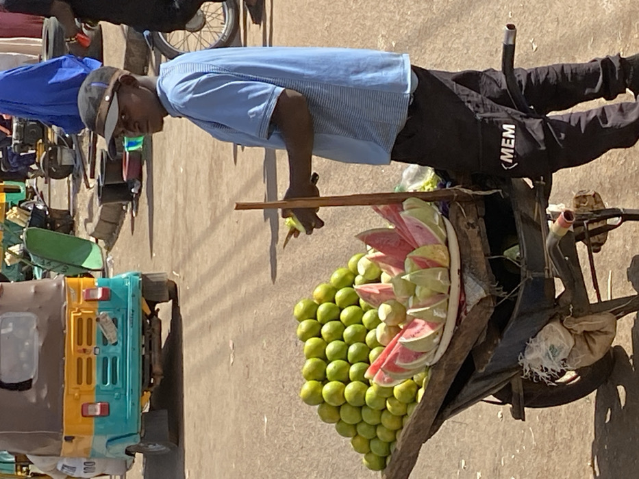 The scene depicts a street vendor operating a fruit cart in Bukuru, Nigeria, under bright sunlight