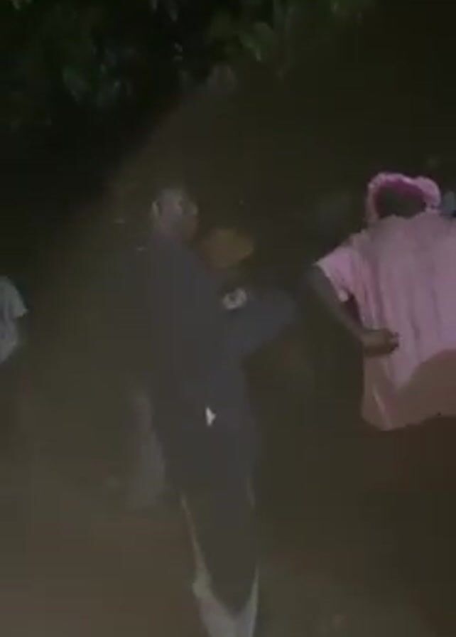 group of people dancing outdoors at night. The location is poorly lit but appears to be an open area with trees visible in the background. At least four individuals are seen dancing to music; one is wearing a pink shirt and head covering, another is in a dark jacket and light pants, and others wear blue and green shirts. The camera appears to be hand-held, and the focus is on the dancers.
