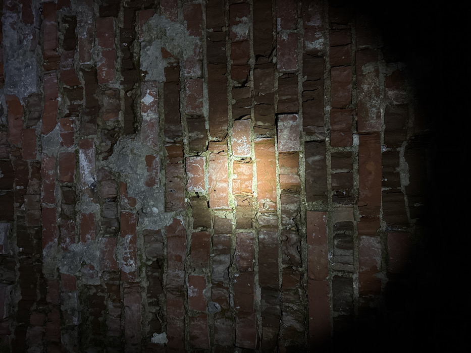 A close-up, vertical photograph depicts a section of a dilapidated brick wall located in Pernik, Bulgaria. The wall is composed of reddish-brown bricks laid in horizontal courses, exhibiting significant erosion, chipping, and surface material loss. The grey mortar between the bricks is deteriorated, unevenly applied, and missing in various sections. Patches of white efflorescence are visible on the bricks and mortar, accompanied by subtle greenish discoloration indicative of biological growth in some areas. A concentrated, circular beam of artificial light illuminates the central-left portion of the wall, highlighting approximately a one-square-foot area of distressed brickwork and mortar, while the surrounding upper, lower, and peripheral areas of the wall remain in deep shadow. No individuals, additional objects, or discernible actions are present in the scene. The structural integrity appears compromised in multiple locations.