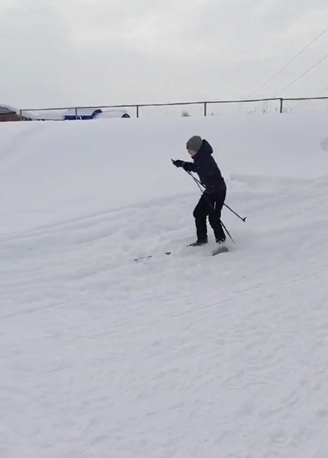 person skiing down a small snow-covered hill on an overcast day. The person, dressed in black ski clothes and a hat, initially skis smoothly but then falls. The skier is facing away from the camera. The person falls forward, landing on their front. Their skis and poles are scattered around them. In the background, there is a red brick building and another person skiing in the distance. A fence runs along the top of the hill. Electrical lines are visible overhead.