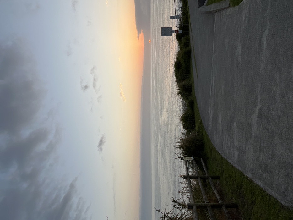 A muted sunset sky hangs above the sea, the light fading into a soft orange glow. A path runs along the coastline, edged with low plants and a wooden fence. Signage is visible further down the path. The sea is calm, reflecting the pale sky. The image evokes a peaceful, coastal ambiance.